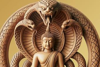 Una de las historias más inspiradoras en el budismo es la de Muccalinda, el naga (mitad hombre, mitad cobra) que resguardó al Shakyamuni tras su iluminación bajo el árbol Bodhi. Según el Muccalinda Sutta (más abajo está el texto completo), cuando Buda alcanzó la iluminación, una tormenta de siete días amenazó su serenidad. En ese momento, Muccalinda emergió de la tierra y, con su propio cuerpo y olvidándose de su propio beneficio, envolvió al Buda; formando un refugio con su capucha para protegerlo del viento y la lluvia.