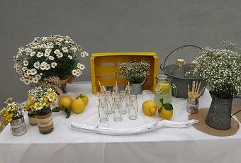 Como queríamos que la comida fuera informal, escogimos que nuestra nueva barbacoa también tuviera un espacio en la decoración y junto a ella pusimos una mesa decorada con cajas de madera pintadas de amarillo, lecheras con pajitas amarillas, dama juanas... y limones para acompañar a la limonada casera fresquita que nos prepararon Danae y Jenny para dar la bienvenida a los invitados. Justo detrás de la mesa de la limonada decoraron la pared gris con marcos de fotos vintage, que dieron muchísimo juego después de la comida, no os podéis imaginar la de fotos que nos hicimos.
