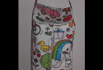 Las que trabajan con peques saben que es muy importante tener a mano las toallitas y los pañuelos de papel, sobre todo en la época de moquitos y resfriados. Así que con esta tela tan apropiada, le he hecho un estuche que podrá colgar en cualquier pomo, ganchito, pizarra, silla... y meter dentro la caja de pañuelitos de papel. Para darle cuerpo, a falta de guata, le he puesto como forro polipiel blanco, así le da cuerpo y le hace no perder la forma.