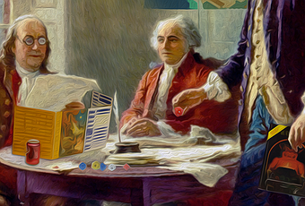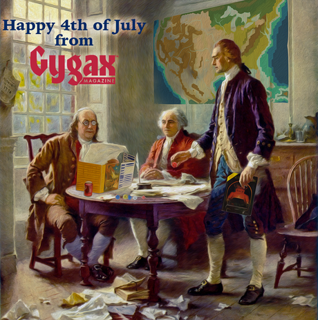 Gygax Magazine,la heredera de Dragon Magazine(De la misma forma que la actual TSR,fundada por los hijos de Gary Gygax, se considera la legitima heredera de la vieja TSR)felicita a sus lectores norteamericanos de EEUU por el 4 de Julio con esta curiosa y bien graciosa imagen.Jugarían a D&D Thomas Jefferson(Sentado),Benjamin Franklin(Aquí hace de DM,tras la pantalla)y John Adams(El que tira el dado)?.Quizás,pero de primeras parece que muy de acuerdo con la edición a la que juegan no se ponen.... XD