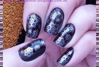 He utilizado la placa Bundle Monster 323 para estampar el motivo de la nieve y el esmalte de Essence de la colección 50´s Girls 04 Love Me Tender. Es un dorado muyyy clarito que casi parece plateado sobre un color muy oscuro como base. En mi opinión estampa bastante bien, así que seguiré utilizándolo para estampar, ya que no me veo con las uñas de ese color...