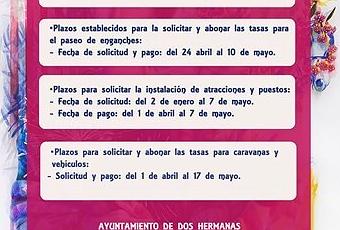 El próximo lunes 24 de Abril se abrirá el plazo para presentar las solicitudes para caballistas y enganches de la próxima Feria de Dos Hermanas 2019, que se celebrará del 16 al 19 de Mayo. – Los plazos establecidos para solicitar y abonar las tasas para el paseo de enganches son: * Fecha de solicitud y pago ...
