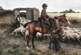 No es un guardia genérico y un pastor. Otro de los grandes puntales de Ferrer- Dalmau es el rigor en la contextualización histórica, sin falta de raccord en uno sólo de sus lienzos. A través de los detalles de la uniformidad , al autor catalán situa la escena en un tiempo muy concreto. El cuadro representa un cabo de la Guardia civil, de caballería, lo sabemos no sólo por el caballo, sino por la bandolera que cruza su cuerpo de cuero amarillo anaranjado (un color que deriva de las primitivas de ante de la época fundacional), con sus tres cartucherines.