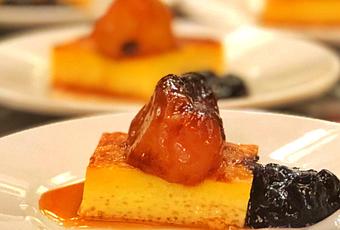 Flan de coco y ron, con manzanas glaseadas y blueberry compote