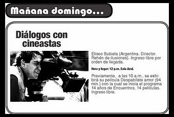 Impedible "Dialogos con cineastas", donde el director de "Rehén de Ilusiones"---Eliseo Subiela... nos contará su experiencia, enecdotas de la película----y sus demás proyectos...