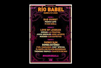 Entre el 4/7 y 6/7 en Madrid y en concreto en IFEMA se celebrará la tercera edición del Río Babel. El cartel suma a nombres como Bad Bunny, Love of Lesbian, Pedro Capó, PJ “Sin Suela”, Jorge Drexler, Muerdo, Los Espíritus, Bomba Estéreo, Fuel Fandango, Chef ’Special y Cuarteto de Nos. Estos artistas se suman a los ya confirmados La Pegatina, Fatboy Slim, Mon Laferte, Dorian, Él mató a un policía motorizado y Trending Tropics. Las tres jornadas son una demostración de clase y estilo internacional que une dos continentes. El festival crece y consolida marca en su tercera edición.