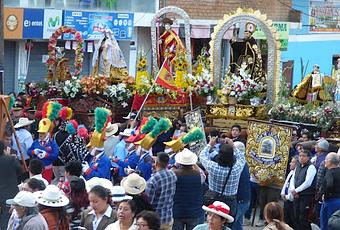 Procesiones por las principales calles de Pomabamba, acompañadas de fieles que portan velas, flores y cánticos de agradecimiento.