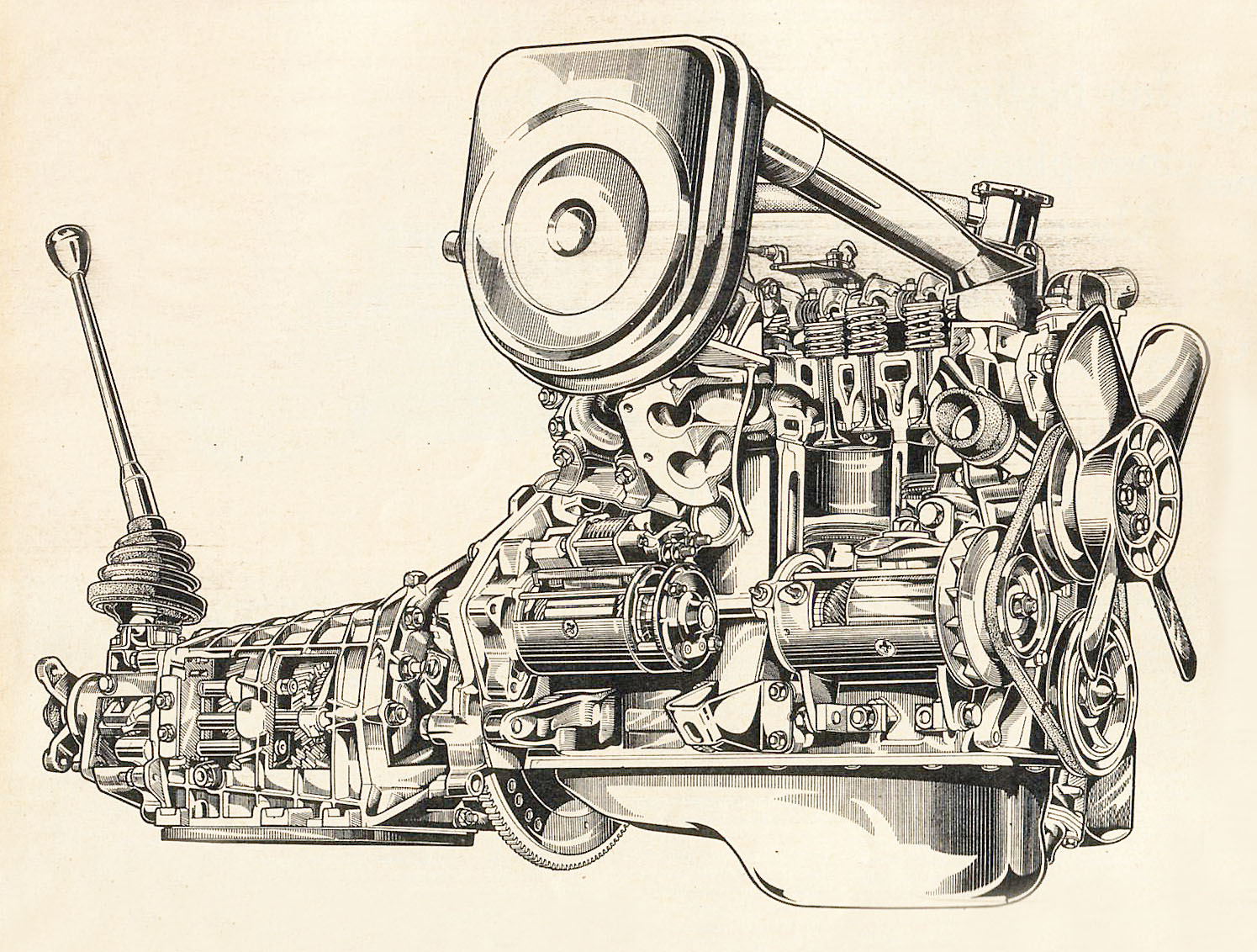 El motor, del cual vemos su transparencia, era de cuatro cilindros en línea con una cilindrada de 1.197 centímetros cúbicos con una potencia de 60 CV DIN a 5.600 revoluciones por minuto y la relación de compresión era del orden de 8,8:1.