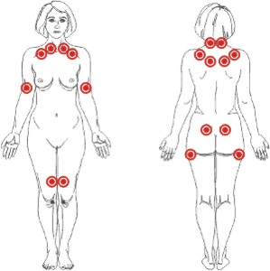 Presencia de puntos dolorosos sensibles ubicados en determinadas zonas que luego mencionaremos, y puede doler cualquier zona del cuerpo a la palpación. Son frecuentes las contracturas. No hay inflamación articular. Es importante descartar otras patologías, como artritis reumatoidea, etc.