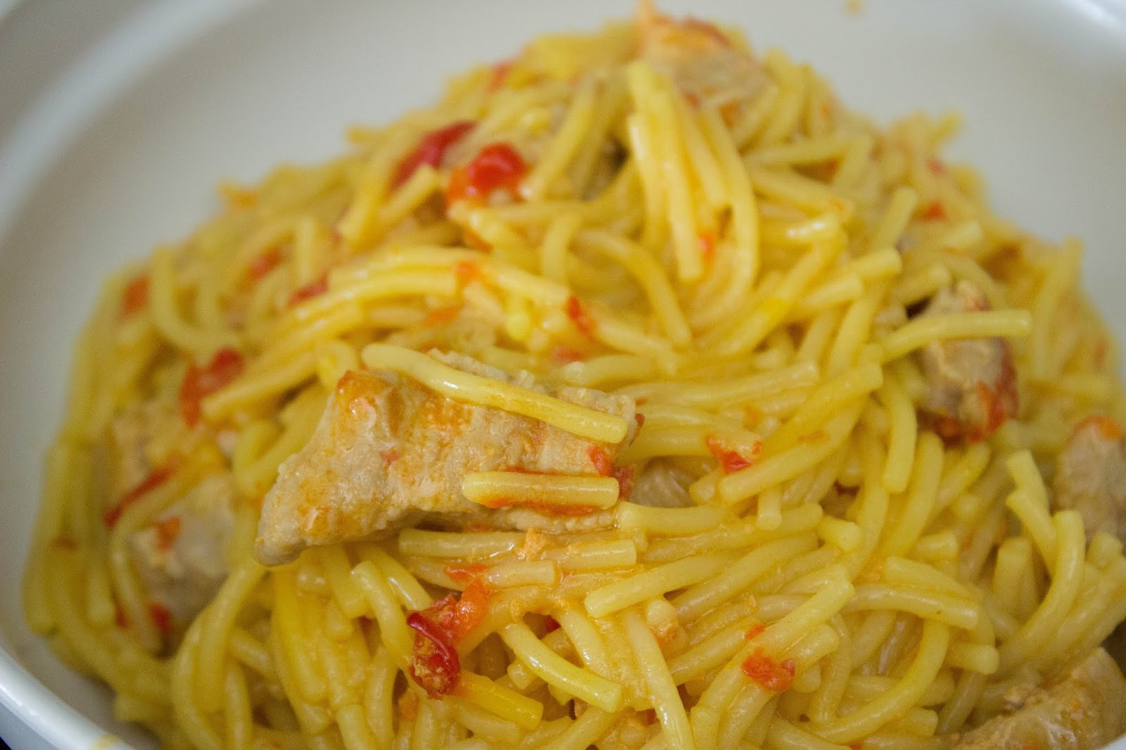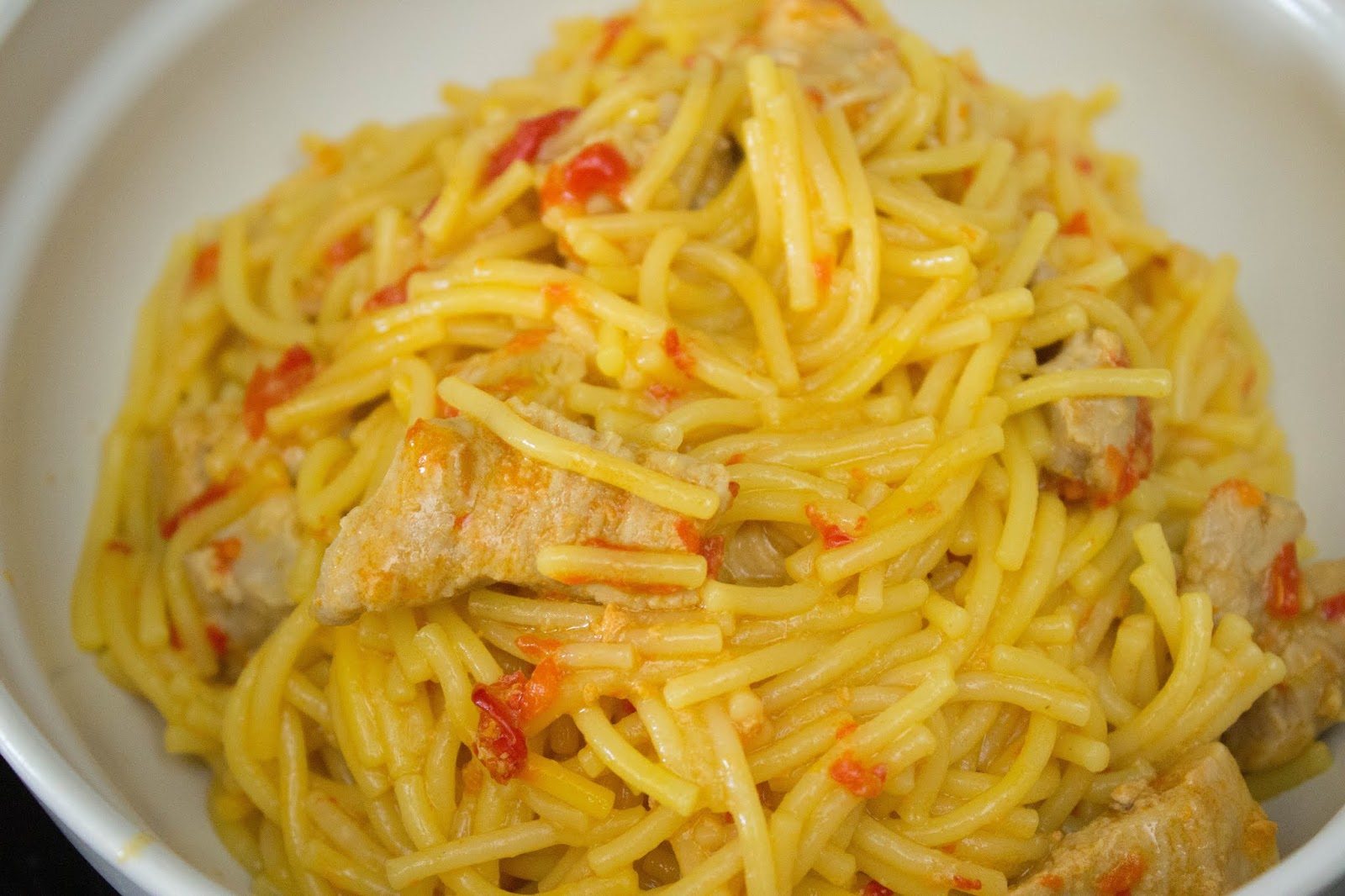 Ingredientes:1 lomo de cerdo de unos 300 gr600 gr caldo1 pimiento rojo250 gr fideos finos (yo usé finos porque en casa no les gustan los gordos)50 gr aceite de olivaHebras de azafránSal