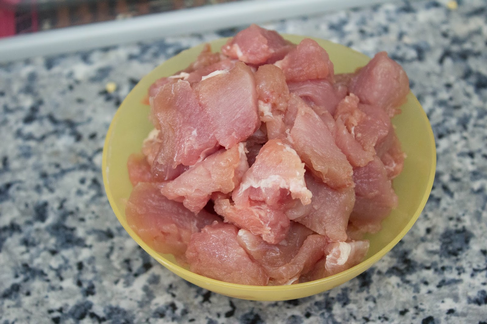 Cortar el lomo en trocitos, yo lo hice en trozos pequeños, peor eso va al gusto. Lo reservamos hasta que acabe de hacerse los pimientos.