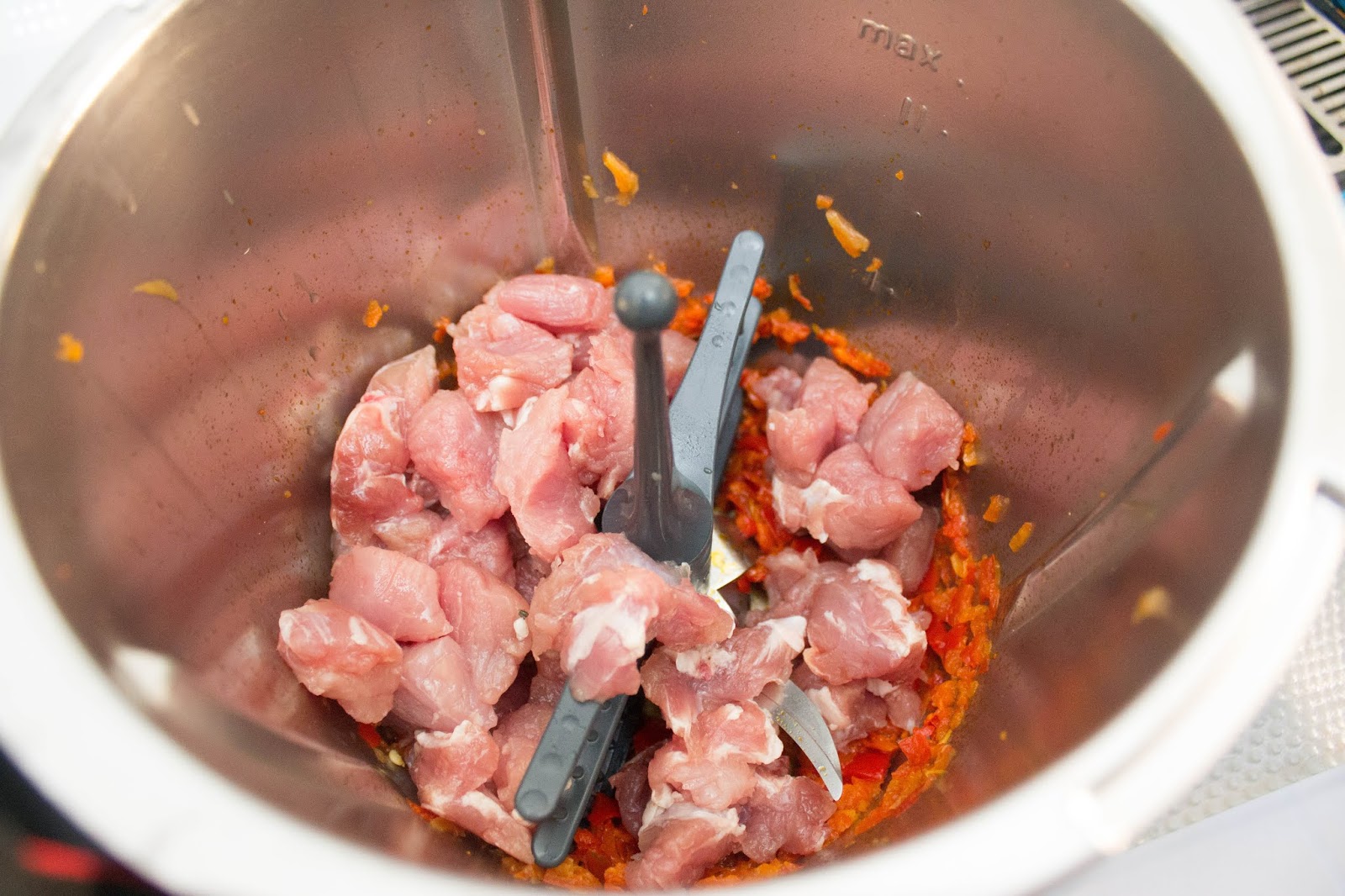 Una vez estén listos, añadimos el lomo en la Thermomix. En la Thermomix el lomo no queda doradito pero queda muy bueno. Se pone la mariposa en la Thermomix para que no se desmigue el cerdo, luego se programa 4 minutos a 100º con velocidad cuchara y giro a la izquierda.