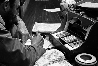 Fidel Castro utiliza uno de los primeros prototipos de computador personal durante un recorrido por el Oriente de la Isla, en febrero de 1970. La máquina la utilizó para el análisis estadístico de los resultados de la Zafra de los Diez Millones. Foto: Liborio Noval