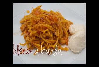 Añadimos los fideos, los rehogamos un poco e incorporamos el fumet junto con el azafrán y el colorante. Comprobamos el punto de sal.