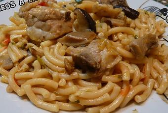 Sofreir las costillas y reservar. En ese aceite, hacer un sofrito con la cebolla, pimiento, ajo y tomate. Cuando esté listo, añadir el revuelto de setas hasta que veais que las setas están tiernas y han perdido el líquido que sueltan. Incorporar de nuevo las costillas y los fideos. Y rehogar bien para que se integren los sabores y los fideos se tuesten. Cubrir de agua. Desmenuzar una o dos pastillas de avecrem, dependiendo de la cantidad de agua que hayáis utilizado. En este punto es opcional añadir un poco de colorante alimentario o de azafrán. Dejar que termine la cocción según el tiempo que marque el paquete de la pasta.