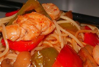 En un wok y si no teneis en una sartén, poneis un chorrito de aceite de oliva y a fuego fuerte dorais primeramente la pechuga hasta que coja color, la retirais y después las gambas.