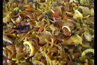 300 gr. de fideos gordos 500 gr. de calamares Un tomate maduro Una cebolla Un pimiento verde mediano Una zanahoria 2 dientes de ajo Aceite de oliva Una cucharadita de colorante Un litro de agua o caldo de pescado Sal