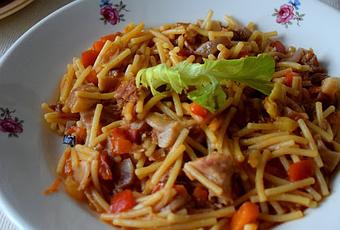 Hacemos una cruz en el tomate y lo sumergimos en agua hirviendo unos segundos. A continuación lo pasamos por agua fría y lo pelamos. Se pican en taquitos (brunoise).Agregamos el tomate a la cazuela, salpimentamos y removemos para mezclar y dejamos hacer 10 minutos.Incorporamos las carnes picadas, damos unas vueltas para que se impregnen de la salsa y se calienten un par de minutos. Agregamos los fideos y sofreímos ligeramente. Añadimos el pimentón, cubrimos con agua hirviendo y dejamos cocer a fuego suave, hasta que esté a dente 10, 12 minutos, apagamos el fuego, dejamos reposar 3-4 minutos y servimos.
