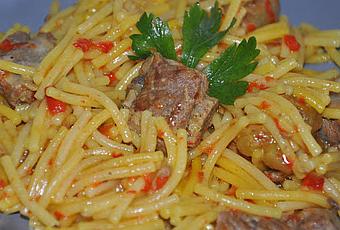 500 Grs. De Costilla De Cerdo Troceada 1 Pimiento Rojo 1 cebolla 1 Tomate Sal Pimienta 250 Grs. De Fideos nº4 Azafrán Molido Carmencita 1/2 L. De Caldo Carne o Pollo