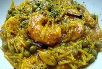 - Preparar un sofrito con 1 cebolleta, 1 diente de ajo, ½ pimiento rojo, 2 zanahorias, perejil, ñora y 2 tomates, todo picado. Pasar por la batidora y echar en una cacerola. Dejar cocer un poco, añadir los fideos con un poco de azafrán, dar unas vueltas y cubrir con el fumet preparado y una hoja de laurel. Dejar cocer suave, y cuando ya casi estén cocidos, añadir los gambones pelados, unos mejillones cocidos y sin cáscara, y una latita de guisantes cocidos.