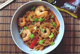 Mientras se termina de hacer la verdura y las gambas, poner en una cacerola con abundante agua y el sobre saborizante de la pasta. Una vez empiece a hervir, añadir la pasta y tenerlo cociendo tres minutos o hasta que se absorba el agua removiendo con un tenedor la pasta para que no se quede pegada.