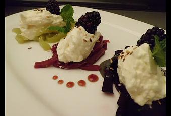 4º Presentar el plato, colocando unos fideos de los zumos en el fondo del plato, encima de cada nido de frutas un poco del esponjoso de queso y decoraremos con unas moras silvestres.