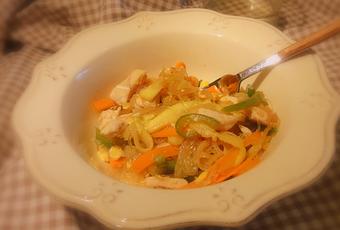 Ingredientes para los Fideos de soja con pollo y verduras (4 personas):- 1 paquete de fideos de soja (podemos usar fideos chinos o Noodles)
