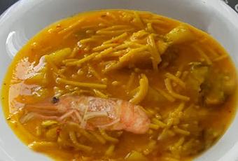 INGREDIENTES:1 Calamar1/4 Kg. Magra de cerdo150 Gr. Gambas1 Pimiento seco1 Tomate1 Cebolla pequeña3 Dientes de ajos1 Pimiento verde tierno (los de freír)1 Sobrecito de Azafrán molido 1/2 Pastilla de Avecren2 Hojas de laurelSal Aceite de olivaFideos