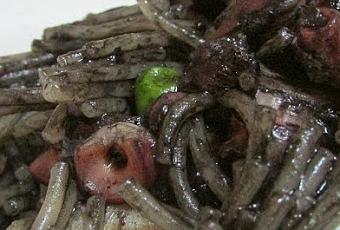- En cuanto empiece a hervir añadimos los dos bolsitas de tinta de calamar y los fideos, volvemos a dejar hervir e introducimos en el horno que teníamos precalentado.