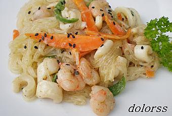 Los vermicelles no quedan blancos una vez cocidos, parecen tiras de celofán . ** Se puede hacer el plato con cualquier tipo de pasta larga: espaguetis, tallarines, .. ** Mejor utilizar el cuerpo de los calamares, o chipirones ** se puede emplear en lugar de salsa de soja, salsa de pescado. ** c/p = cuchara de postre ** c/s = cuchara sopera