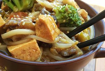 - Pour the sauce into the pan and bring to boil. Low the heat and add udon noodles and tofu. Cook for another 10 minutes over medium until all the liquid is reduced. Serve and enjoy.