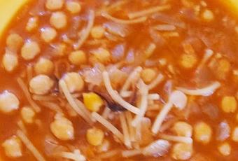 Ingredientes1 bote garbanzos cocidos ya escurridos1 cebolla50gr aceite oliva1 crda aceite de oliva500gr caldo verduras ( o 1/2 litro de agua y una pastilla para caldo vegetal)100gr fideos anchos1 lata mejillones en escabeche