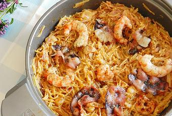 Finalmente añadimos el queso rallado y dos huevos batidos. Removemos bien para que se mezcle bien con los fideos. Dejamos cocinando más un par de minutos para que el huevo cuaje. Apagamos el fuego y dejamos reposar y colocamos sobre los fideos las lonchas de bacon y las gambas enteras y espolvoreamos una pizca de orégano.