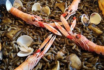 INGREDIENTES PARA DOS PERSONAS: 100 grms. de jibia, 50 grms. de almejas, 4 mejillones, 50 grms. de cigalitas de Málaga, 50 grms. de gambas blancas, 1 tomate pequeño rojo, medio pimiento verde, un trozo pequeño de cebolla blanca, dos dientes de ajo, seis cucharadas soperas de melsa (el interior del bazo de la jibia), una cucharada pequeñoa de pimiento molido, medio vaso pequeño de vino blanco, un vaso pequeño de aceite de oliva virgen extra, la tinta de la jibia (en su defecto, una bolsa de tinta de calamar que ya venden en cualquier supermercado), 2 vasos pequeños de fideuá (fideo gordo hueco), sal y cinco vasos de agua ( se necesitará aproximadamente el doble de volumen de caldo que de fideuá) .