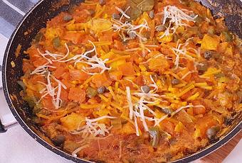 2.- Agregamos la salsa de tomate y los fideos. Cubrimos todo con agua, rectificamos de sal. Cocinamos los fideos 8 minutos a fuego medio, añadimos las alcaparras y los lomos de merluza cortados en 3 trozos cada uno. Dejamos que la fideuá de merluza y calabaza al fuego 8 minutos. Retiramos del fuego,esparcimos por encima el queso emmental y dejamos que se funda con el calor.