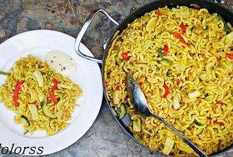 Ingredientes para 4 personas: 400 gr. de fideo medio curvo800 gr. calamares limpios1 puerro1 pimiento verde italiano pequeño½ pimiento rojo 1 calabacín pequeño1 c/p rasa de pimentón de la vera1 c/p rasa de especias para pinchos1,5l de caldo de pescado Sal, Aceite de oliva virgen extra