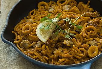 INGREDIENTES10 Calamares pequeños y limpios.1 Lata de berberechos.50 gr. de salsa de tomate estilo casero.1 Cebolla.1 Diente de ajo.2 Cucharadas de aceite de oliva.Unas hebras de azafran.200 gr. de fideos para fideua.300 ml. de caldo de pescado.1 Vasito de vino blanco.Unas hojas de perejil.Sal y pimienta al gusto.