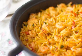 Ayer preparé fideuá de gambas y pollo en casa para comer. La receta de la base de la fideuá me la pasó mi hermano Roberto porque yo no la había hecho nunca y quizás si eres valenciano y me lees me dirás que eso ni es fideuá ni es nada pero a mí me resultó una fideuá exquisita.La fideuá la he preparado con gambas peladas y pechuga de pollo para que al comerla no haya que estar separando los caparazones de las gambas pero si lo prefieres puedes usar gambas sin pelar y trozos de pollo con piel y huesos.