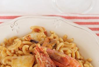 - Añadimos los fideos de fideua en la paellera y también las gambas peladas y los mejillones, y sofreímos a fuego fuerte unos segundos.