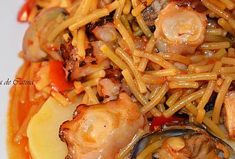 1/4 kgr de almejas1 pulpo2 tomates maduros1/2 pimiento rojo1 cebolla pequeña2 dientes de ajo1/2 cucharadita de pimentón250 gr de fideos gordosunas hebras de azafráncaldo de pescado (en mi caso agua de cocer el pulpo)2 patatasaceite y salPreparación: