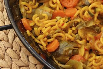 Necesitaremos (para 2 personas) - 1 ajo - 1/2 cebolla mediana o pequeña - 30 gr de pimiento rojo - 30 gr de pimiento verde - 30 gr de aceite de oliva - 1 zanahoria pelada y cortada en rodajas - 30 gr de calabacín cortado en trocitos - 3 alcachofas peladas y cortadas en cuartos - 75 gr de champiñones laminados - 30 gr de tomate triturado - 1/2 cucharadita de pimentón dulce - Colorante alimentario - 140 gr de fideo para fideuá (del semicircular, como el que veis en la foto) - 60 gr de guisantes de lata - 400 gr de agua o caldo de verduras - Sal o 1 pastilla de caldo Elaboración con Thermomix - Ponemos en el vaso ajo + cebolla+ pimiento rojo y verde. Trituramos 4 segundos, V5. - Añadimos el aceite. Programamos 5 minutos, Varoma, giro a la izquierda, Vcuchara. - Añadimos zanahoria y calabacin. Programamos 5 minutos, Varoma, giro a la izquierda, velocidad cuchara. - Añadimos alcachofas + champiñones + tomate + pimentón. Programamos 5 minutos, Varoma, giro a la izquierda, velocidad cuchara. - Añadimos agua + colorante + sal o pastilla. Programamos 10 minutos, Varoma, giro a la izquierda, velocidad cuchara. - Añadimos los fideos y guisantes. Programamos 5 minutos, varoma, giro a la izquierda, velocidad cuchara. - Sacamos a una paella y acabamos de cocinar a fuego fuerte, para que los fideos de abajo se empiecen a pegar y hagan el "socarrat" que llamamos aquí en Valencia . Elaboración tradicional- Ponemos el aceite a calentar en la paella. Mientras picamos el ajo, cebolla y los 2 pimientos. - Añadimos a la paella y sofreimos unos minutos. - Añadimos la zanahoria y calabacín y sofreimos unos minutos. - Añadimos alcachofas, champiñones y sofreimos unos minutos. - Añadimos el tomate, sofreimos y ponemos el pimentón. Damos unas vueltas para que no se queme y a continuación añadimos el agua y sal o pastilla de caldo. - Cuando hierva añadimos el colorante. - Pasados 10 minutos, rectificamos de sal y añadimos los fideos. - Distribuimos bien los fideos y las verduras y ya no volvemos a remover. Cuando el fideo esté casi en su punto subimos el fuego para que los fideos de abajo se empiecen a pegar y hagan el "socarrat" que llamamos aquí en Valencia. Sitos a tod@s!!