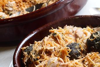 Vuelvo con una de salado que después de tartas y bizcochos cada vez que miro el blog me sube el azúcar... y con esta me retiro por unos días! o eso intentaré.Aprovechando que es domingo, que los supermercados están cerrados y que yo los domingos no tengo ganas de complicarme la vida pues he abierto la nevera y ¿qué ha sido lo primero que me he encontrado? Sobras!! sí, sobras de un día, sobras de otro, sopa de cebolla por un lado, dos pechugas por otro, espinacas con bechamel de ayer. Y he pensado pues mira, vamos a ver que sale del reciclaje.Cierto es que me podía haber facilitado más el almuerzo recalentando las sobras esas y haciendo un tapeo de todo pero yo no soy de recalentar, soy más de reciclar, el cubo de basura en mi casa no se llena mucho que no está la cartera para andar derrochando, ser cocinero consiste en ingeniártelas con lo que tengas.Desde ya te digo que no es una fideuá común, así que no me critiques jajaj, no es el típico plato marinero que se elabora con pescado y marisco fresco de forma parecido a la paella, es un símil. Eso sí, lo que me ha gustado respetar es la paellera o en mi caso cazuela en la que se suele elaborar y los fideos finos que son el origen y no los fideos gordos esos huecos que los llaman “fideos para fideuá”, esos no! A mi lo que me gusta es que los fideillos finos cuando acabes la fideuá y la dejes reposar se retuerzan y se suban para arriba como gusanillos, eso es tan característico de este plato.