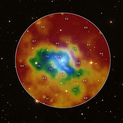 La imagen superior muestra la variación de la temperatura a lo largo de la galaxia NGC 5813. Créditos de la imagen: rayos-X: NASA/CXC/SAO/S. Randall et al.; óptico: SDSS