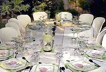 Entre ambas mesas y siguiendo el camino que las une, pequeños arbolitos y velitas en forma de flor rosa