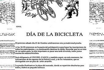 - Onil (Ver plano): El sábado, 23 de octubre "Día de la Bicicleta". A las 16,30h desde la puerta del Polideportivo (allí mismo se harán las inscripciones) y tras un recorrido por la población terminará en la Plaza del Mercado, donde habrá un pequeño refrigerio.