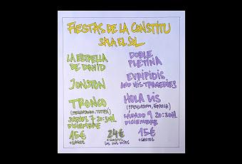 La Fiesta de la Constitu será una fiesta a doble jornada, en El Sol donde habrá mucha música en directo. Serán dos jornadas de mucha música en directo, dos jornadas con un claro propósito, pasarlo en grande viendo música en una gran sala como es El Sol. Fiesta a doble jornada en El Sol, en el caso del jueves, podremos ver aLa Estrella de David, Jonston y a Tronco en el escenario, una primera jornada llena de matices y llena de calidad, en el caso del sábado, estarán Doble Pletina, Evripidis and his tragedies y Hola Lis, otros tres grandes proyectos que terminarán de completar esta fiesta.