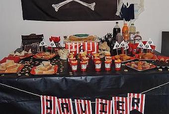 Bueno, esta es la parte que decoramos en el comedor, con su bandera pirata, banderitas en el faldón de la mesa con el nombre y años que cumplía, el pirata Garrapata colgado que vestimos con el chandal del cole del cumpleañero, a los niños no se les pasó por alto este detalle y nos preguntaban porqué llevaba el chandal y nosotras muy serias les decíamos que como no estudiaba mucho pues repetía y repetía curso y así se había quedado!!!. Creo que alguno a partir de ese día se aplicó más en clase jajajajaja.Cuando los piratas invitados iban llegando a la fiesta se les iba disfrazando con un gorro pirata, parche y pañuelo, las piratitas en tonos rosas por supuestísimo jijijiji. Al final de la fiesta los complementos que sobrevivieron se lo llevaron cada uno el suyo.