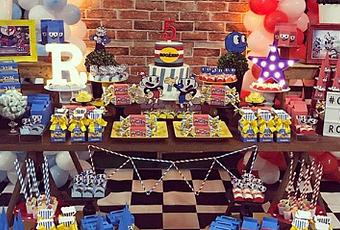 Cuphead y mugman son los personajes principales más resaltados en esta fiesta, se puede apreciar sobre todo los colores azul y rojo en los globos y en los dulces personalizados con los rostros de los personajes de este juego tan popular. Al fondo hay un cuadro de los dos hermanos, banderines, una torta de dos pisos que tiene al frente a los personajes mencionados con anterioridad.
