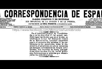 Martes, 13 de Septiembre de 1892 en el que nos avisa que en el inmediato pueblo de Fuenlabrada y entre los días 13 y 17 tendrán lugar las fiestas en honor al Santísmo Cristo de la Misericordia.