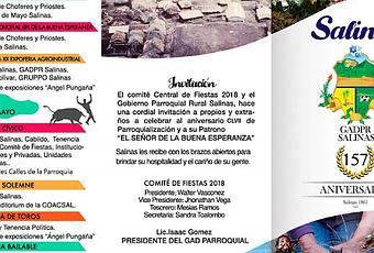 Programa oficial de las Fiestas de Salinas en honor a nuestro patrono Jesús de la Buena Esperanza, organizado por el GADPR Salinas, Comuna Matiavi Salinas, Gruppo Salinas, Asociacion Texal, Funorsal, Cooperativa Salinas, Mision Salesiana, Tenencia Politica, Municipio de Guaranda, Prefectura de Bolivar, Producoop.